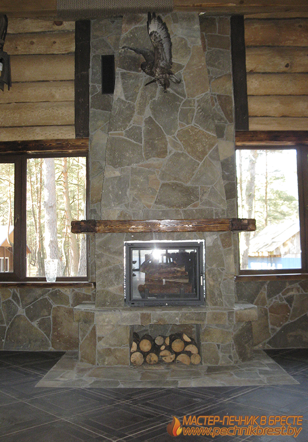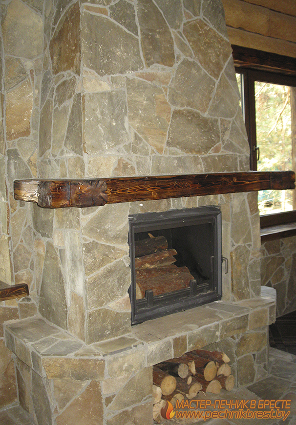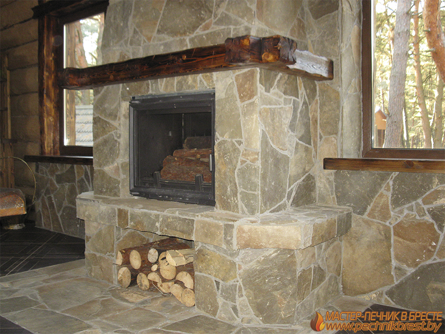 Камин с дровницей – топка KRATKI (Польша), отделка натуральный камень пластун.